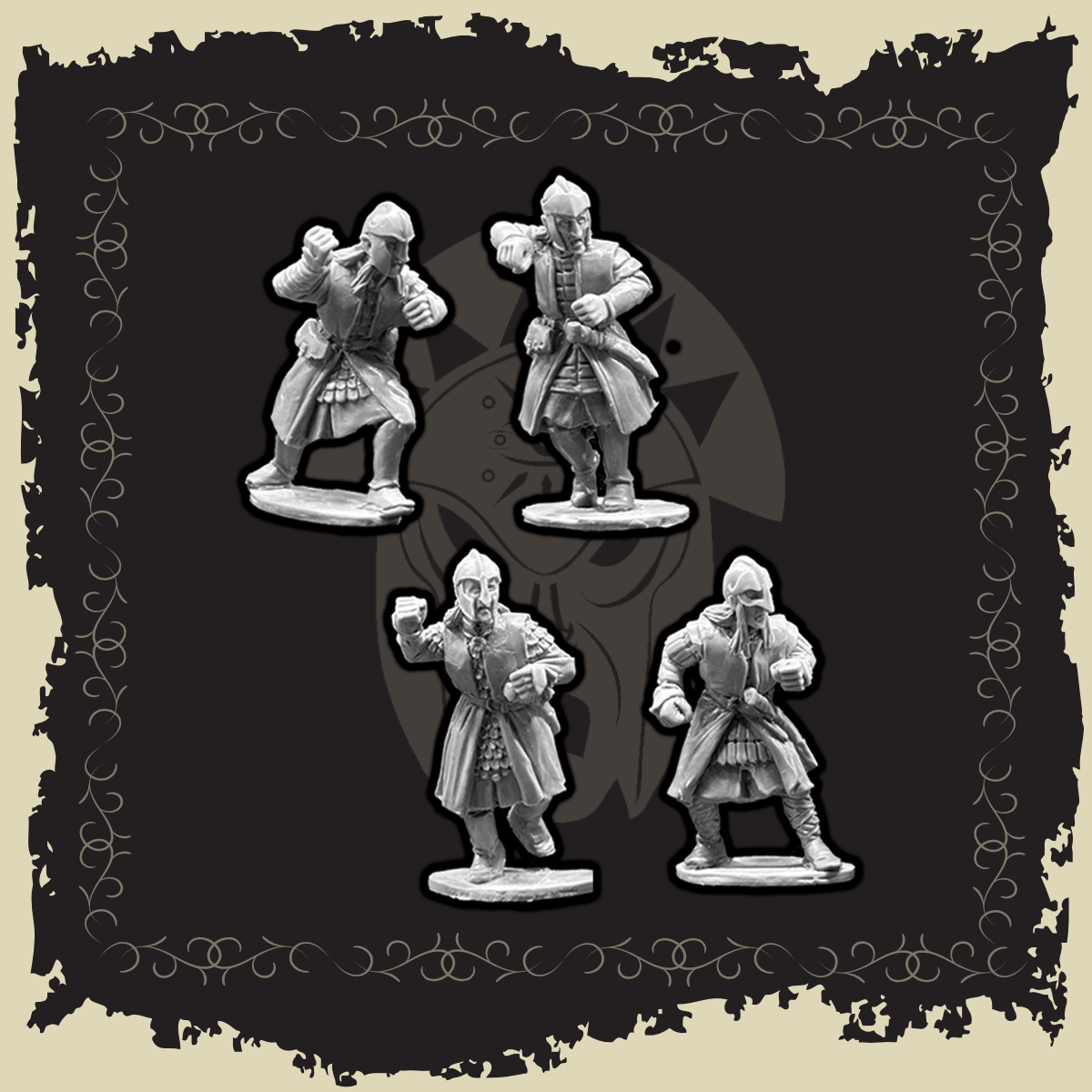 The set contains four, 28mm metal miniatures & 25mm round bases. Miniatures supplied unpainted and may need some assembly. All weapons and shields are included. Please note, you will receive a random assortment of shields.